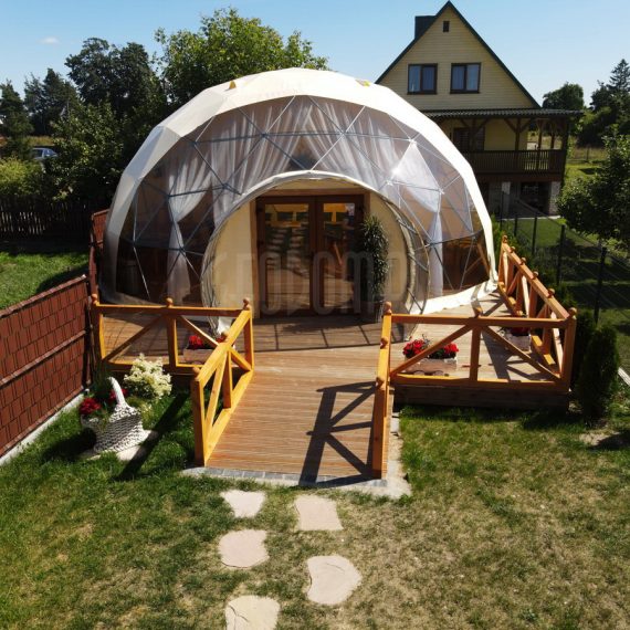 Les dômes peuvent être équipés de fenêtres panoramiques, rondes ou triangulaires, ainsi que de larges portes arrondies. Les fenêtres transparentes peuvent être facilement ouvertes, fermées, retirées ou équipées de moustiquaires. De plus, pour améliorer l’acoustique, un revêtement insonorisant en matériau non tissé peut être installé, renforçant le confort à l’intérieur.