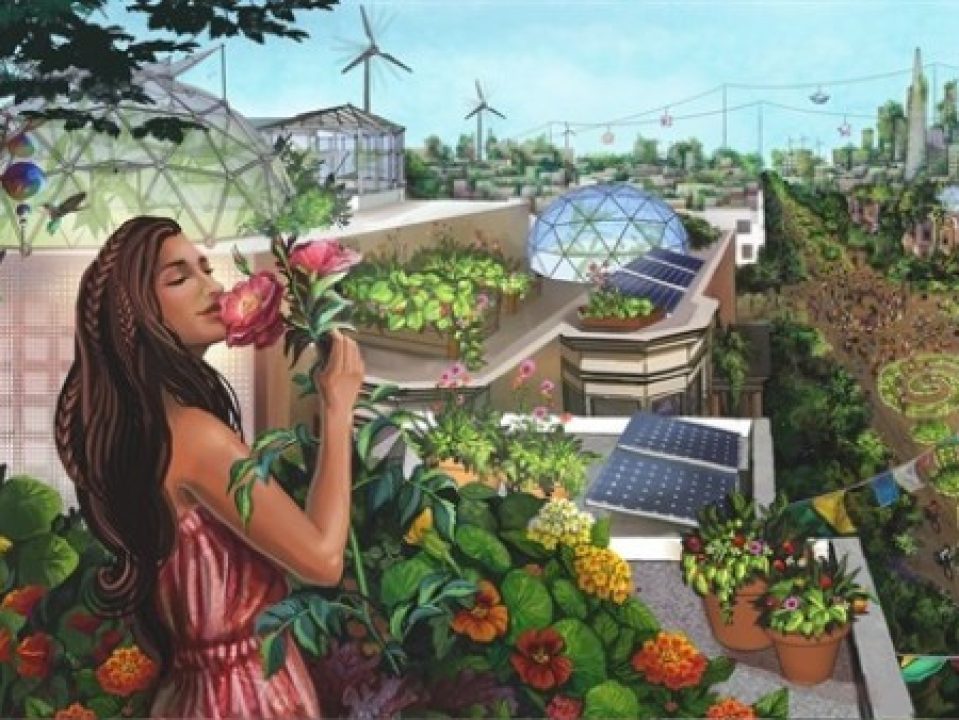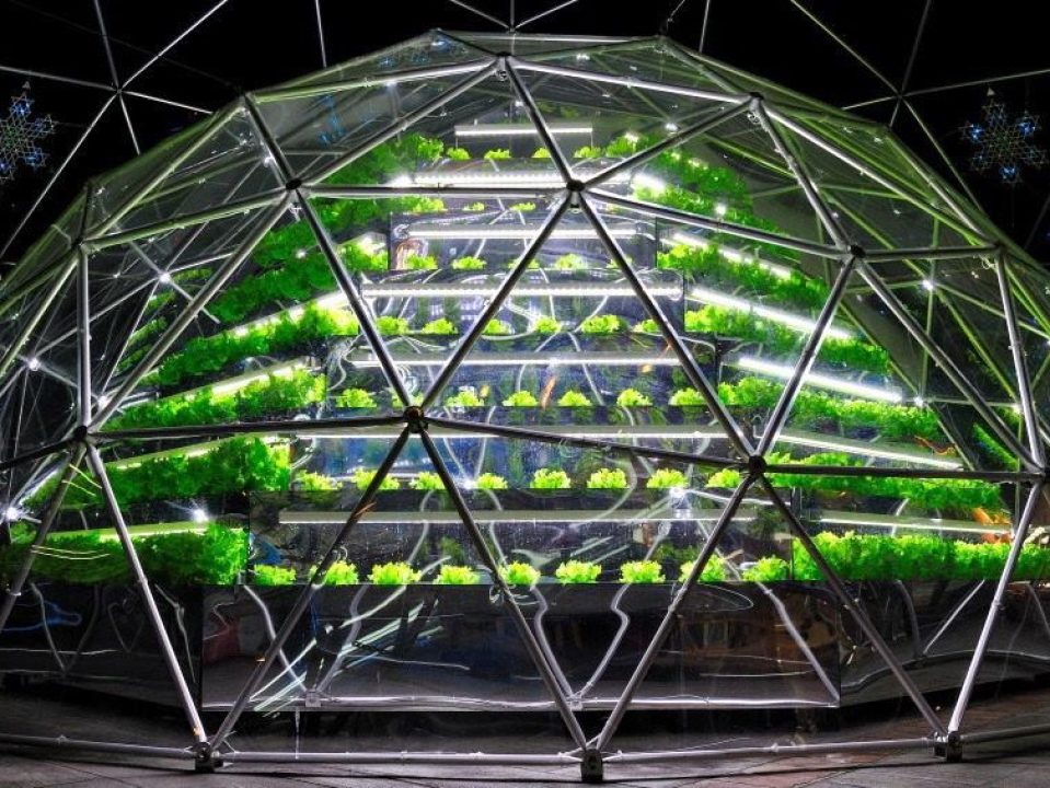 Geodesic dome Solar Greenhouse to grow your own food. The spherical shape means sunlight is always striking part of the dome in a perpendicular fashion for maximum solar gain. The spherical shape also creates the least heat transfer suface possible for maximum heat retention during the winter months.