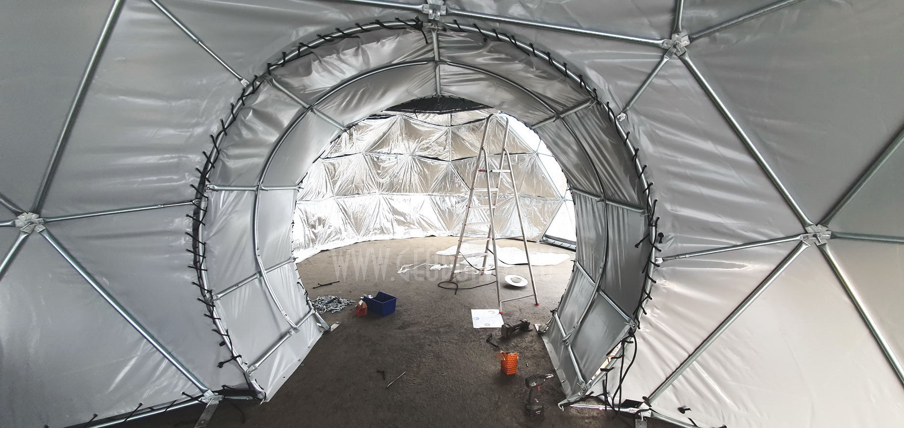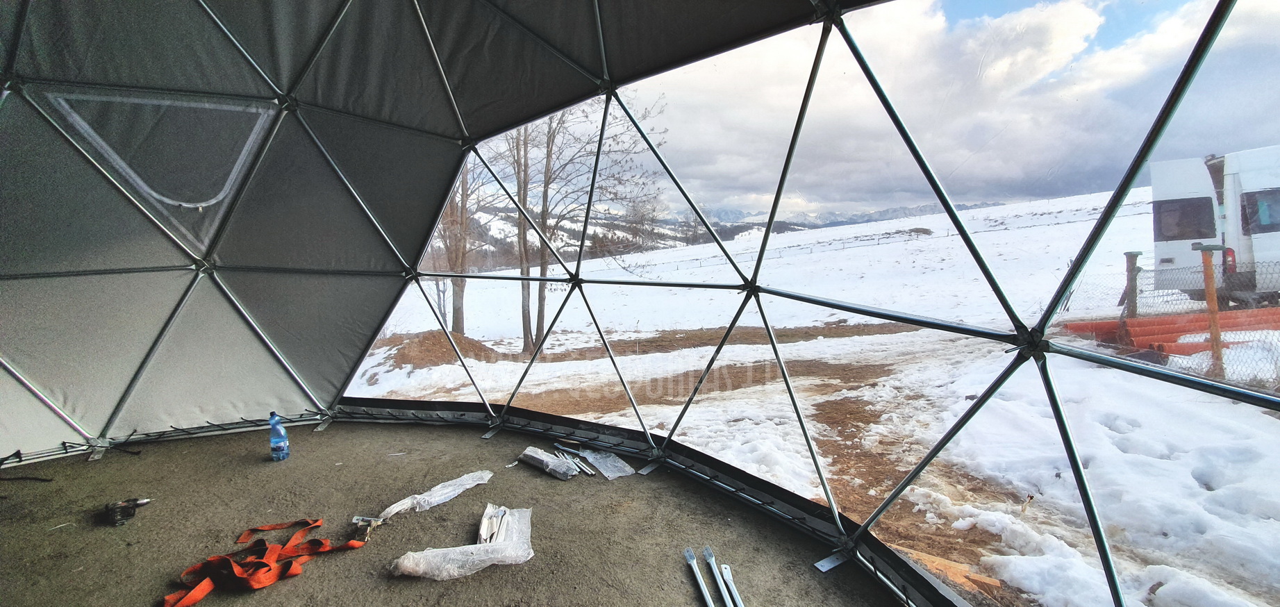 Pro kupolo langą galima stebėti saulėlydžius. Kupolas pritaikytas oro temperatūrai nuo -30 iki +80 laipsnių Celsijaus nes turi THERMIC.PRO terminę membraną. Šio sezono pristatymas, 8 metrų skersmens 50 m2 ploto kupolas – “GLAMPING DOME”.