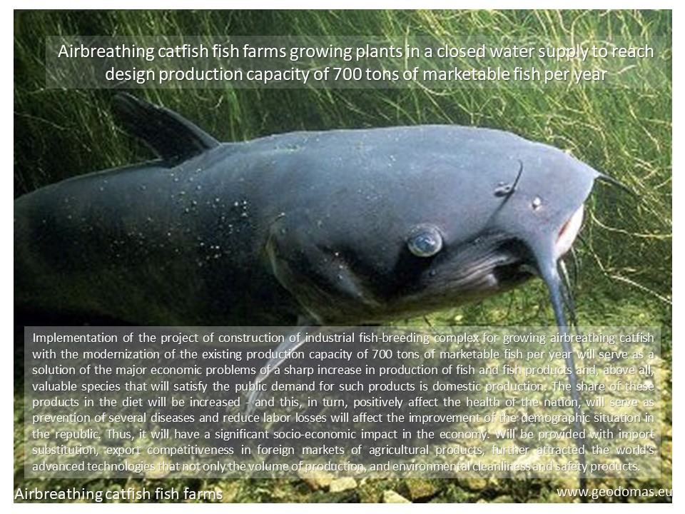 Implementation of the project of construction of industrial fish-breeding complex for growing airbreathing catfish with the modernization of the existing production capacity of 700 tons of marketable fish per year will serve as a solution of the major economic problems of a sharp increase in production of fish and fish products and, above all, valuable species that will satisfy the public demand for such products is domestic production. The share of these products in the diet will be increased – and this, in turn, positively affect the health of the nation, will serve as prevention of several diseases and reduce labor losses will affect the improvement of the demographic situation in the republic. Thus, it will have a significant socio-economic impact in the economy. Will be provided with import substitution, export competitiveness in foreign markets of agricultural products, further attracted the world’s advanced technologies that not only the volume of production, and environmental cleanliness and safety products.