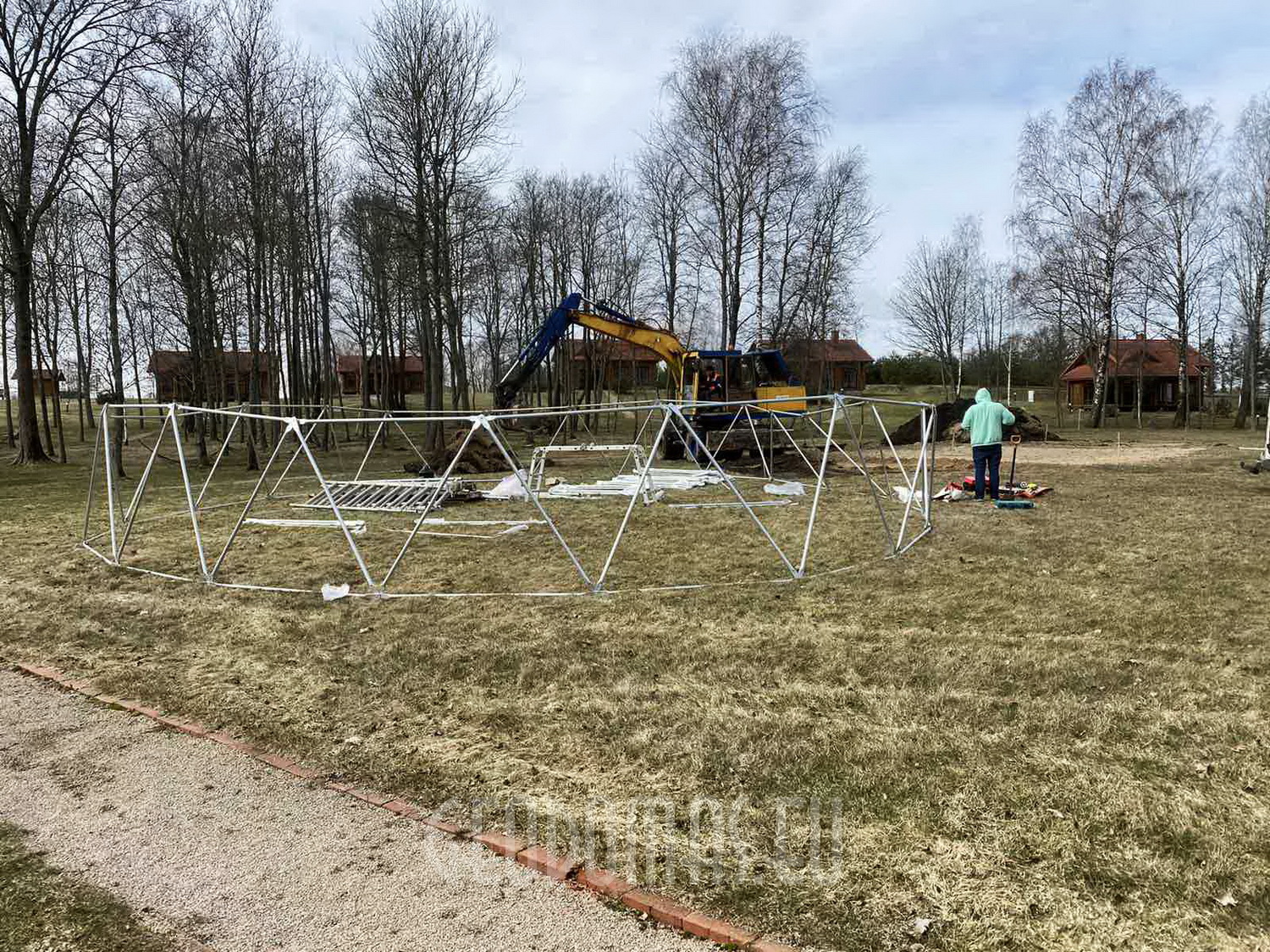 Metalinė, cinkuota sferinės formos konstrukcija | Kupolo formos paviljono rėmas pagamintas iš cinkuoto plieno, vieno varžto jungtys , apatinės jungtys kupolo tvirtinimui.