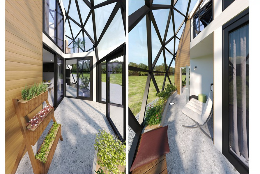 Įėjimas į namą su gaubtu ir prieangiu. LUX CLASS ALU dvigubos durys. Pagrindinis 85 mm ALU profilio durų privalumas – puiki izoliacija. Jos atsparios pažeidimams ir apsaugo namą nuo įsilaužėlių.