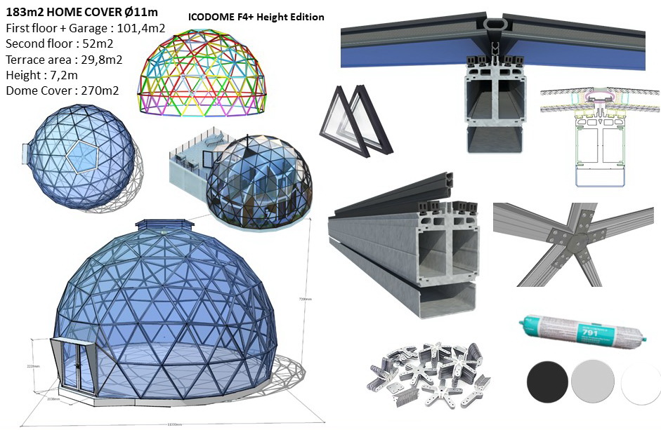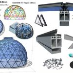 - Aliuminio konstrukcinis rėmas ir dengto plieno kupolo jungtys. Montavimo rinkinys: Tarpinės dalys, varžtai, tvirtinimo elementai, visų elementų žymėjimas ir pakuotė.