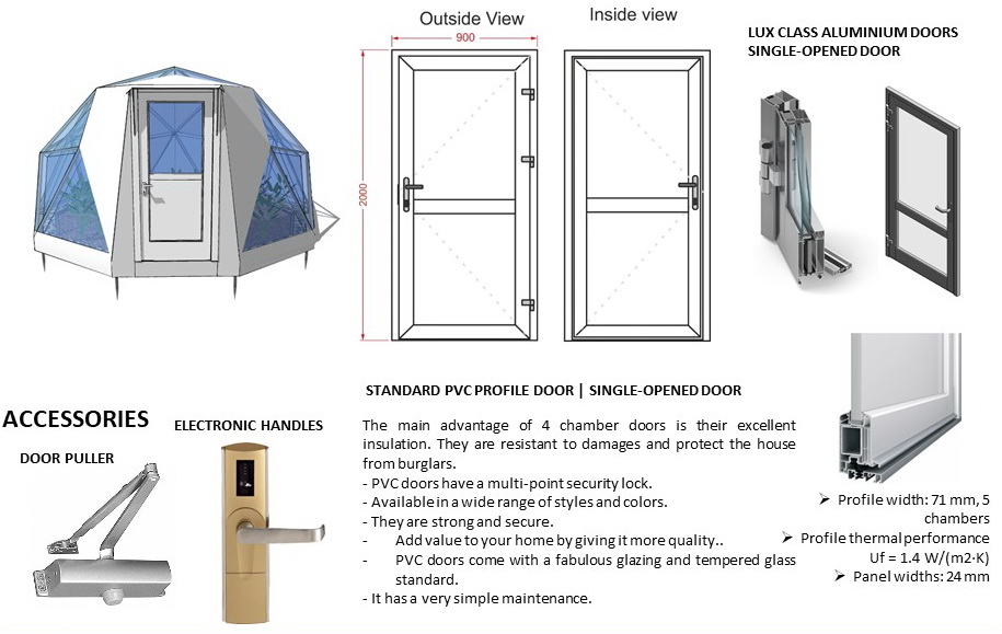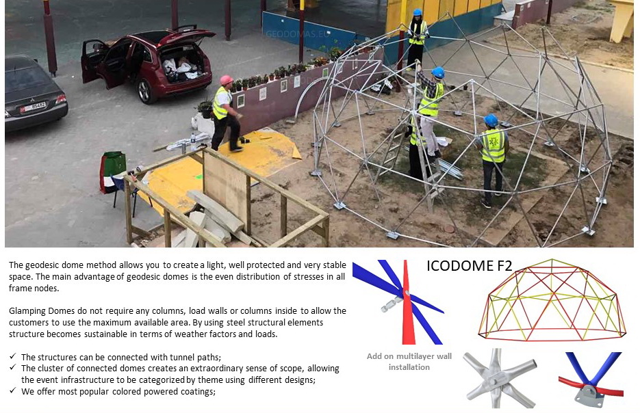 Glamping Domes do not require any columns, load walls or columns inside to allow the customers to use the maximum available area. By using steel structural elements structure becomes sustainable in terms of weather factors, livetime and loads.- The structures can be connected with tunnel paths;