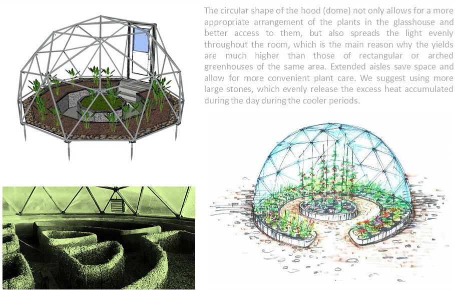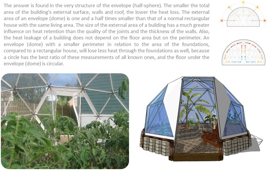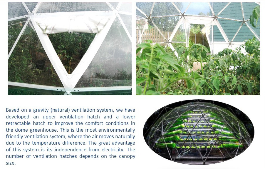 The geodesic dome structure allows you to create a light, well protected and very stable space. The main advantage of geodesic domes is the even distribution of stresses in all frame nodes.