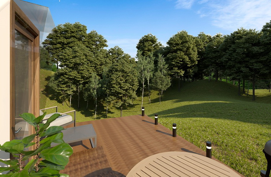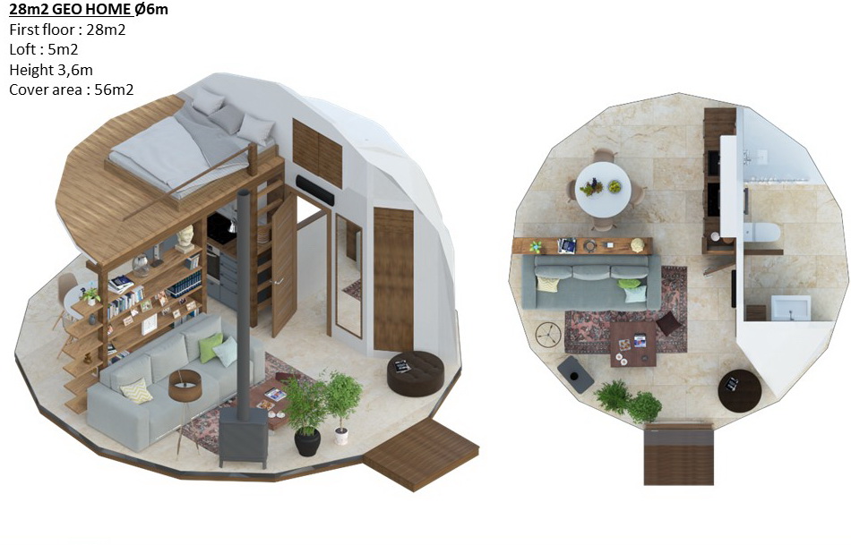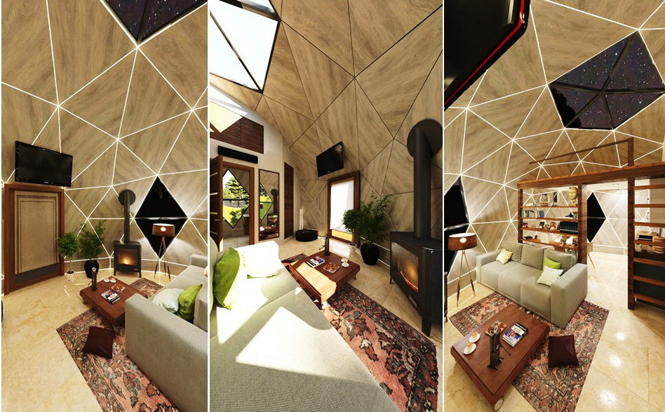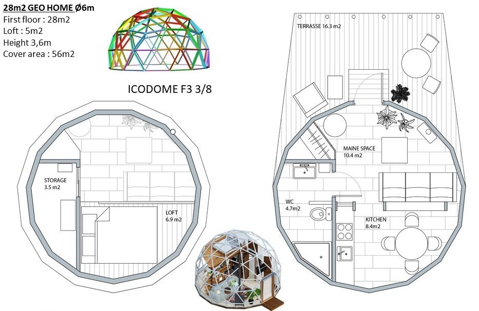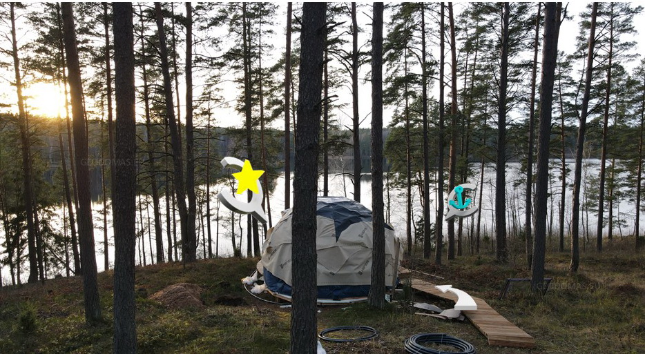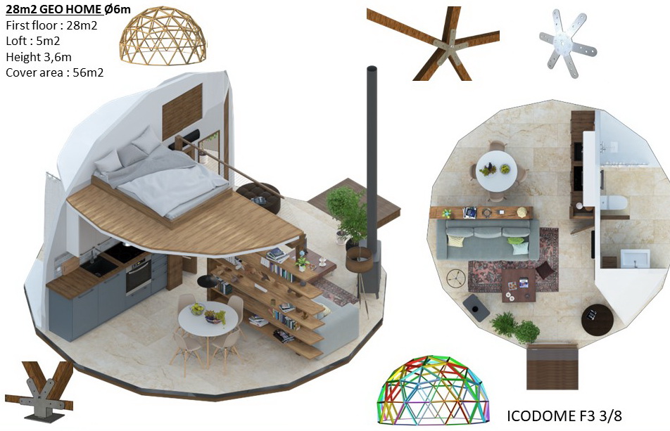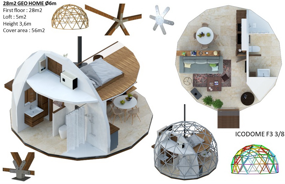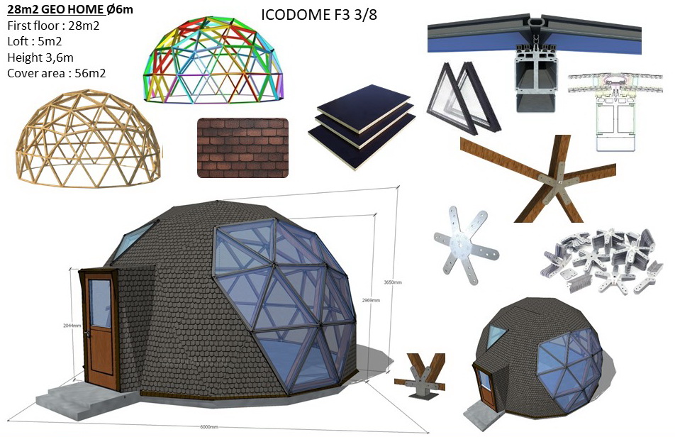 Trikampės formos plokštės, fasado plokštės COSMO PLOKŠTĖS : 25mm (pagrindinis variantas), PVC-XPS-PVC plokščių struktūra. Tvirtinimo elementai plokštėms su tarpine. Montavimo klijų rinkinys sandariklių apdorojimui. Baltas fasado sandariklis-klijai apdailos ir dekoratyviniams darbams. Skardinė perimetro palangė pamatų hidroizoliacijai. Gravitacinė vėdinimo sistema apatiniame kupolo perimetre. Pilnas montavimo komplektas ir fasado surinkimo dokumentacija.
