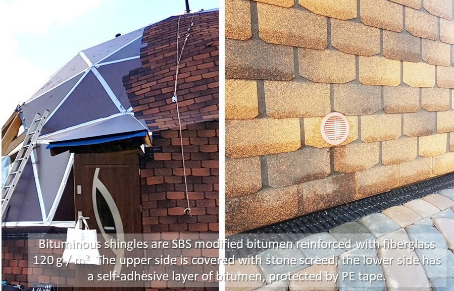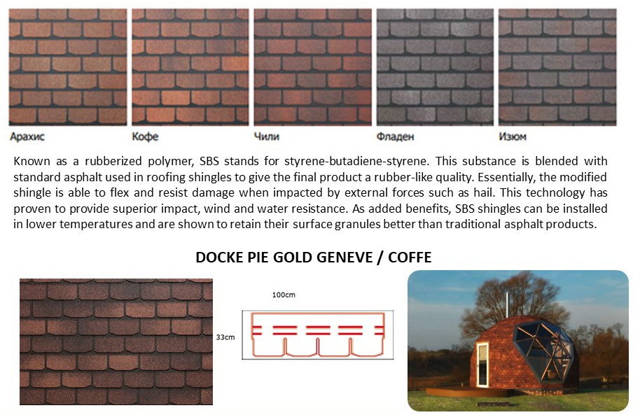 Bituminės čerpelės yra SBS modifikuoto bitumo, armuotos stiklo audinio pluoštu 120 g/m². Viršutinė pusė padengta akmens barstalu, apatinėje pusėje yra savaime limpantis bitumo sluoksnis, apsaugotas PE juostele.