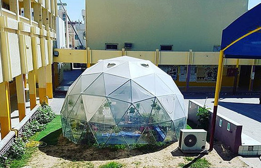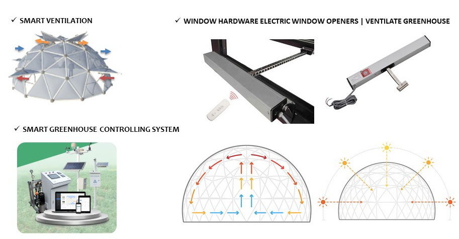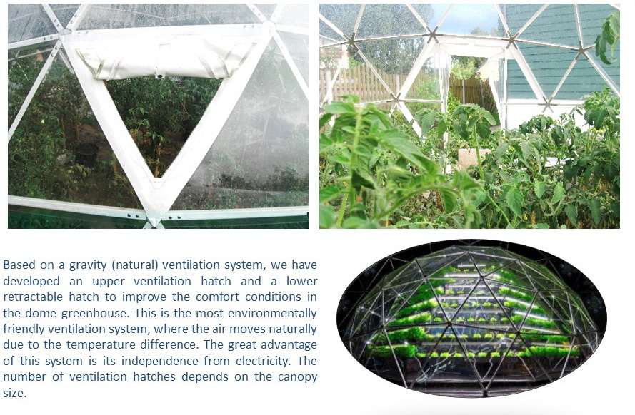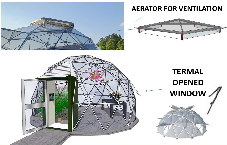 Atskiros kupolo dalys atsidaro automatiškai, kai oras sušyla. Taip vėdinamas oras kupole, jei oras už kupolo sienų yra palankus. Sukūrėme pažangią oro vėdinimo sistemą, kuri gerai optimizuoja oro ir šilumos srautą.