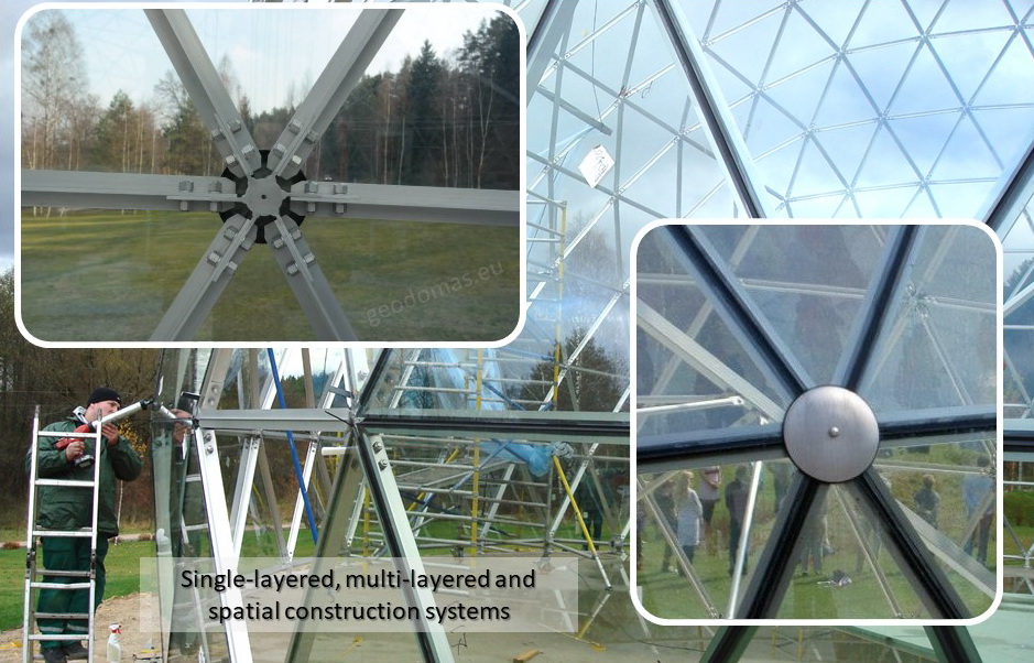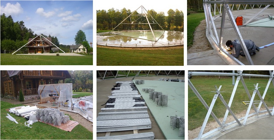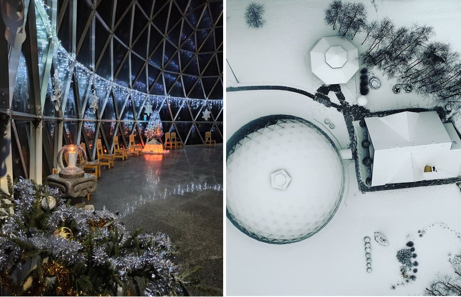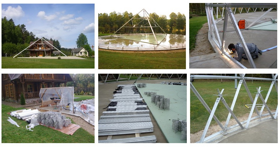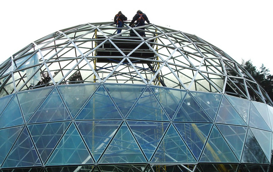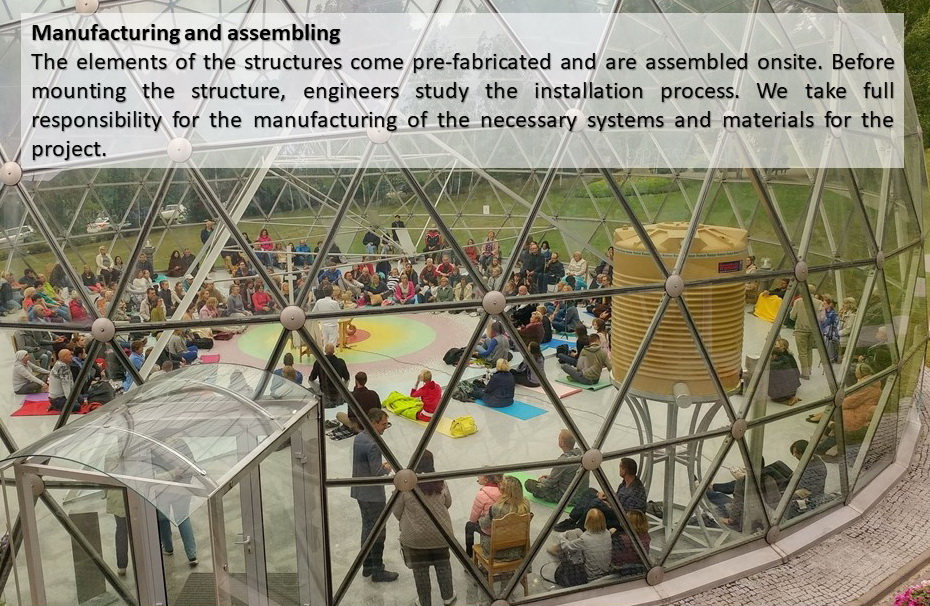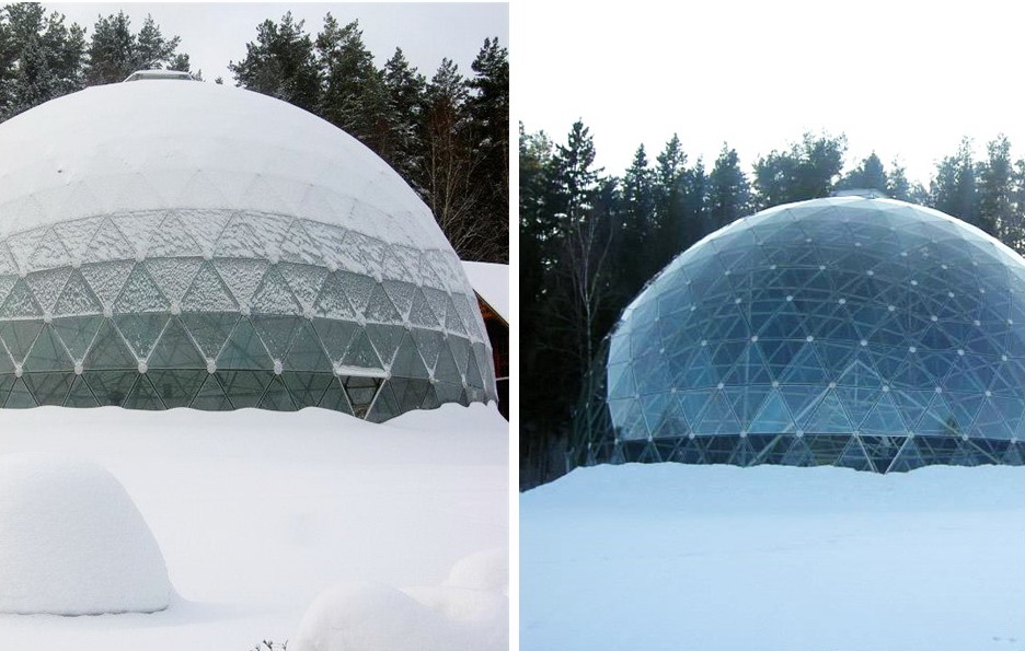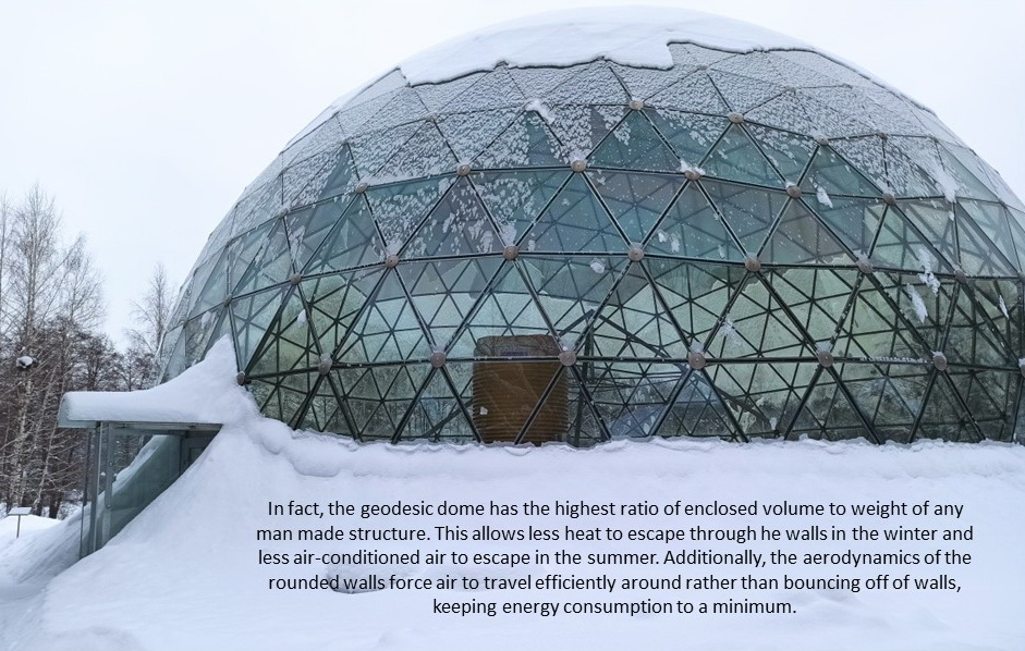 Domes use 30% less surface area to enclose the same amount of volume as a box type structure. This means there is less area for heat to escape or outside air to penetrate. In addition, the spherical shape of a geodesic dome provides for natural and efficient interior air circulation. The natural aerodynamics of the dome means that cold air blows around the home instead of hitting a flat wall and penetrating to the inside.We develop architectural and design projects, residential buildings, based on the geodesic dome, as well as manufacturer of all required elements.